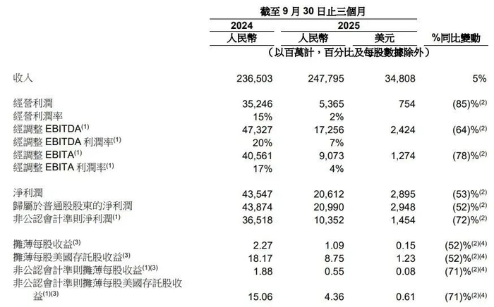 乍一看,这份财报并不好看:实现营收2477.95亿元,同比增长5%;经营利润53.65亿元,同比下降85%;归属于普通股股东的净利润为209.9亿元,同比下降52%。